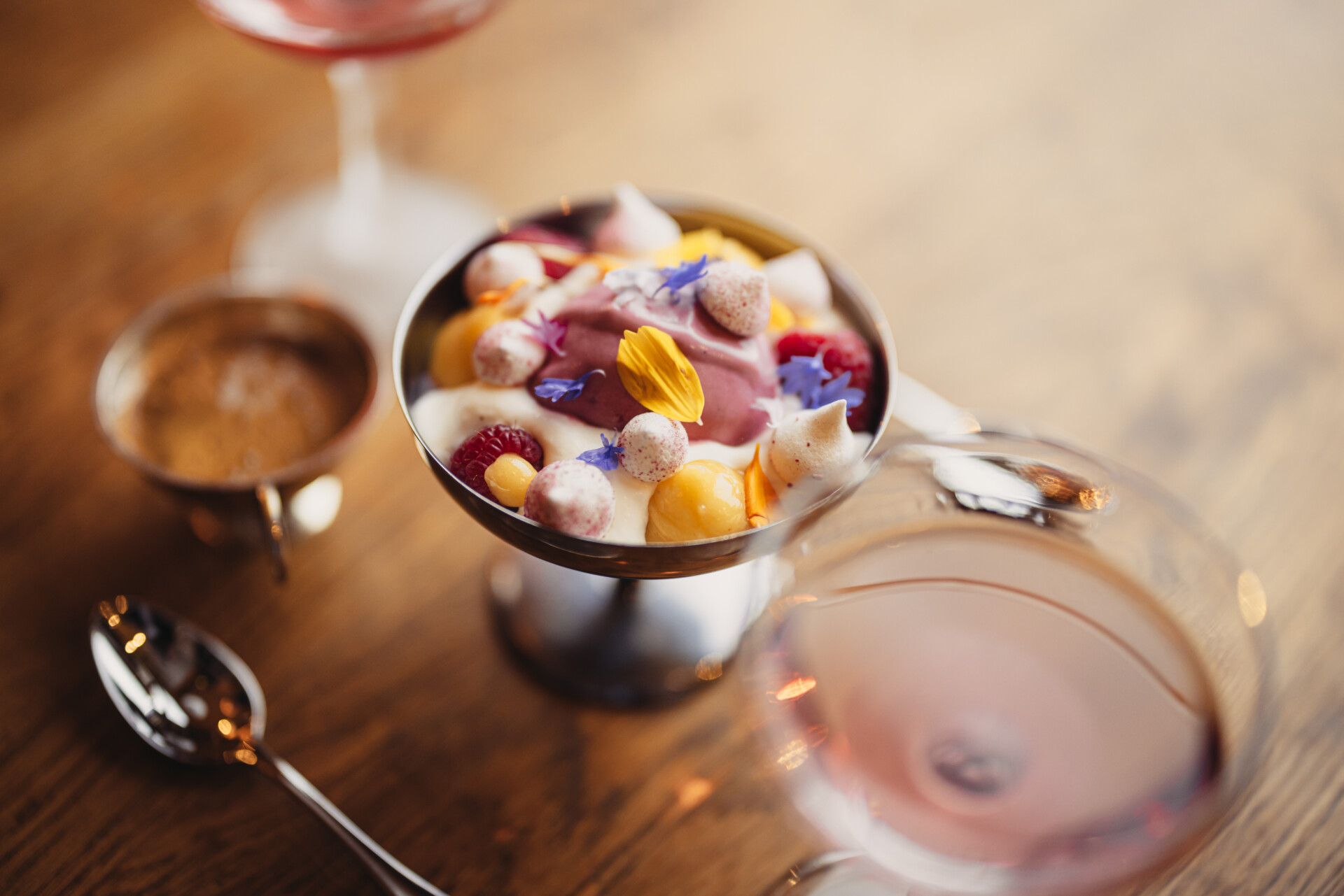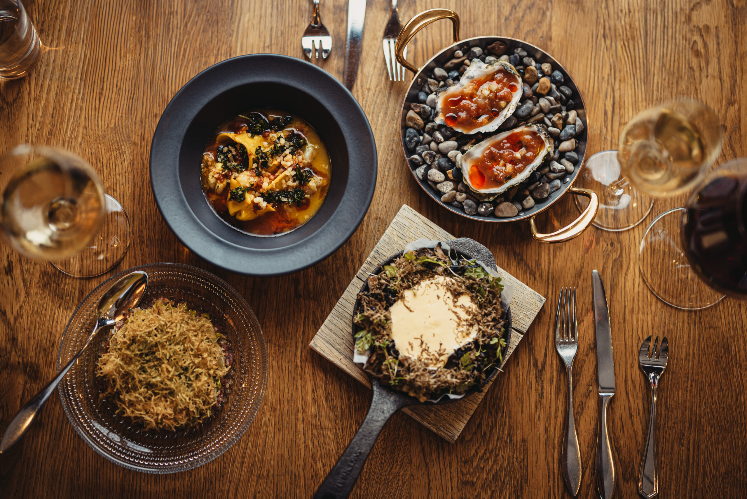 Vi samlas runt den stora marmorskivan i köket och sällskapet serveras fördrink och snacks. Kocken visar tekniker och hur vi arbetar i köket på Portal. Vi pratar om hur man arbetar hållbart i ett kök, hur du tävlar mot kylskåpet och vikten av råvaror i säsong.